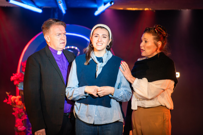 The set, with its neon crosses and holy statue, doesn’t help. Why is Jane McCarry carrying out a fitness for work assessment in a disco chapel?